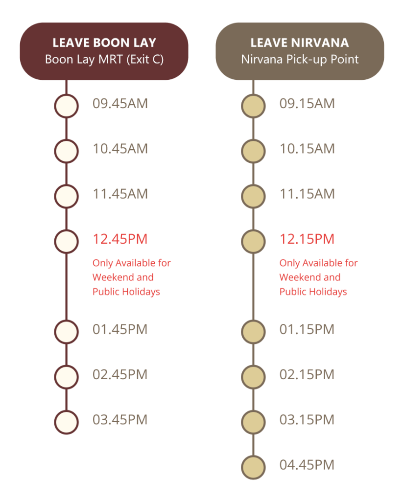 Contact Us Our Branches Contact us at NIRVANA MEMORIAL GARDEN PTE LTD 950 Old Choa Chu Kang Road, Singapore 699816 +65 8223 1171 Enquiry@nirvana.sg Rafeteo@nirvana.sg https://nirvana.sg Notice: JavaScript is required for this content. Shuttle Service Timing Shuttle Service is available on a daily basis, drop off point along Boon Lay Way.